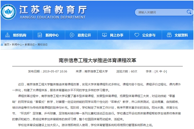 近日,南京信息工程大学整体推进体育课程改革,实现大学体育课程形式多样化、课程内容个性化、课程评价过程化、课内课外一体化,构建了大课程体系,服务体育基础水平不同的学生多样的学习需求。