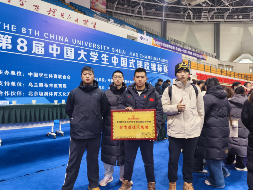 2025年11月28日至12月1日,第8届中国大学生中国式摔跤锦标赛在内蒙古自治区乌兰察布市举行。经过三天激烈角逐,我校学生顾家文(长望学院)、傅秋实(电子信息与工程学院)、凌龙(自动化学院)在教练员熊壮老师带领下,经过多番鏖战,最终两名运动员获得全国第五名的好成绩,同时收获体育道德风尚奖的佳绩。为我校中国式摔跤队拿下了建队以来的开门红。