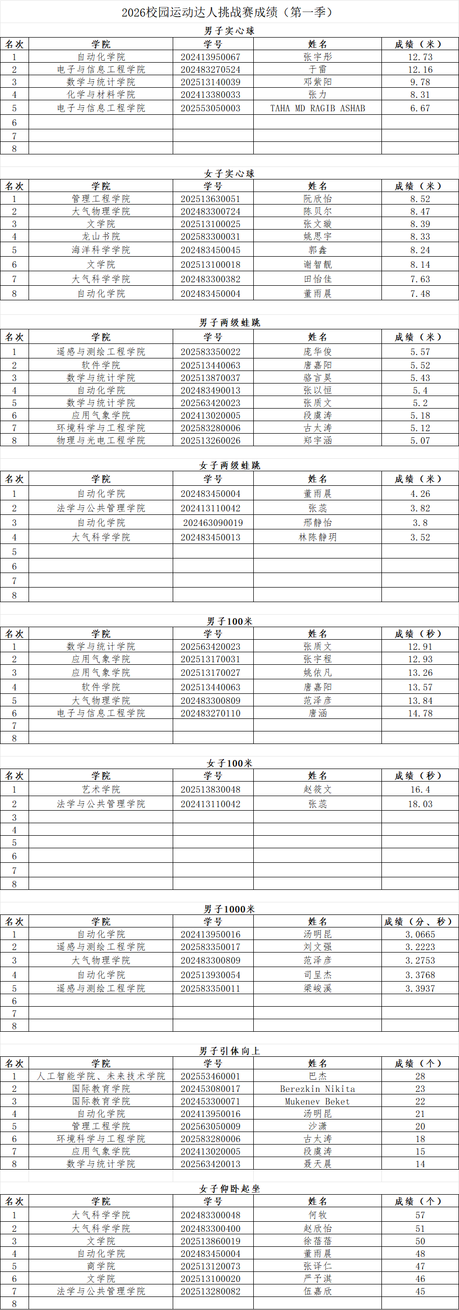 三月金陵,春意正浓,赛场逐光,青春昂扬。2026 年 3 月 25 日下午,南京信息工程大学 2026 第一季运动达人挑战赛于东苑操场顺利开赛。作为学校坚持两年、每月常态化举办的品牌体育赛事,本次比赛吸引全校各学院学子踊跃参与,大家齐聚赛场、奋勇争先,在竞技中展现体育风采,让拼搏精神在校园持续绽放。
