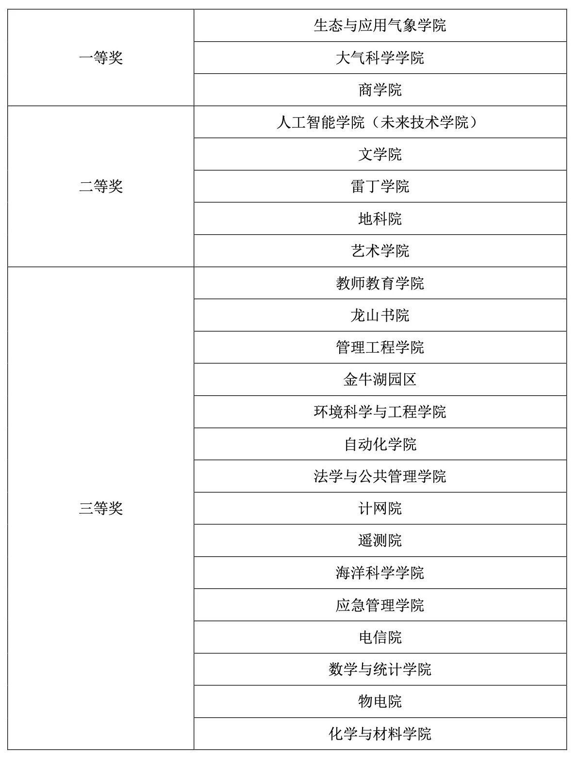 教师教育学院、龙山书院、管理工程学院、金牛湖园区、环境科学与工程学院、自动化学院、法学与公共管理学院、计网院、遥测院、海洋科学学院、应急管理学院、电信院、数学与统计学院、物电院、化学与材料学院获得三等奖